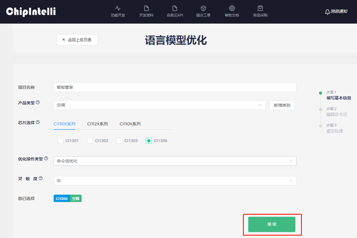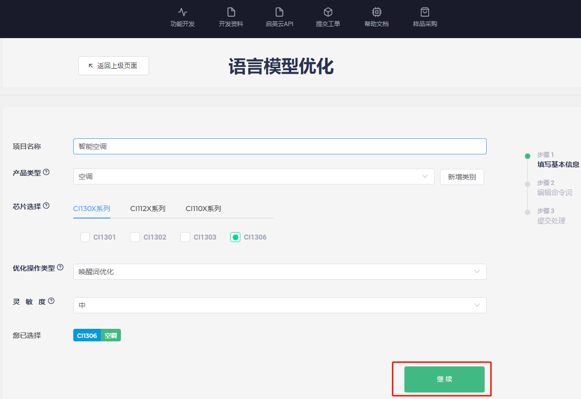 Fill in “project name, product type, language type, chip selection, optimization options, board-level configuration, sensitivity, timbre” and other information according to the specific product to be developed, and then click “Next” (if you have any questions, view comments(?) ). The “optimization” option is the automatic optimization of the language model, which aims to improve the product recognition performance and optimize the confidential parameters of command words and wake-up words (currently, only single wake-up word is supported. If you submit multiple wake-up words, the system will only optimize the first wake-up word, and other wake-up word systems will be treated as command words for optimization). Because the automatic optimization is relatively time-consuming, If you have selected the automatic optimization function when submitting, please wait patiently for the completion of model optimization. An example is shown below: