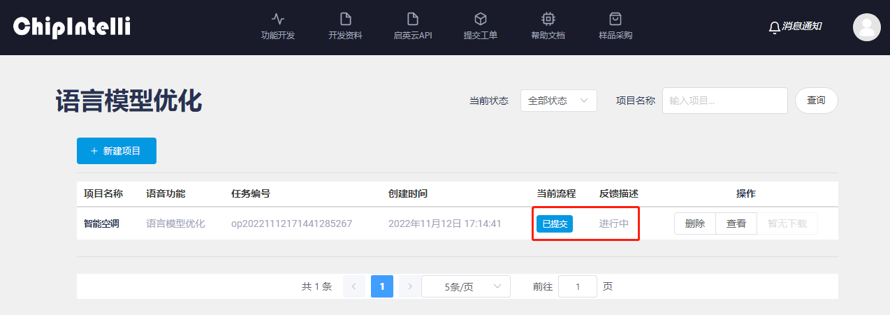 Click “Submit”, and the platform will automatically jump to the project interface to view the progress of this language model in real time.