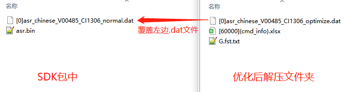 - Open the extracted folder and copy the optimized language model file “[0]asr_chinese_…optimize.dat” to overwrite the existing “[0]asr......dat” file in the CI130X_SDK......\projects\offline_asr_pro_sample\firmware\asr directory;