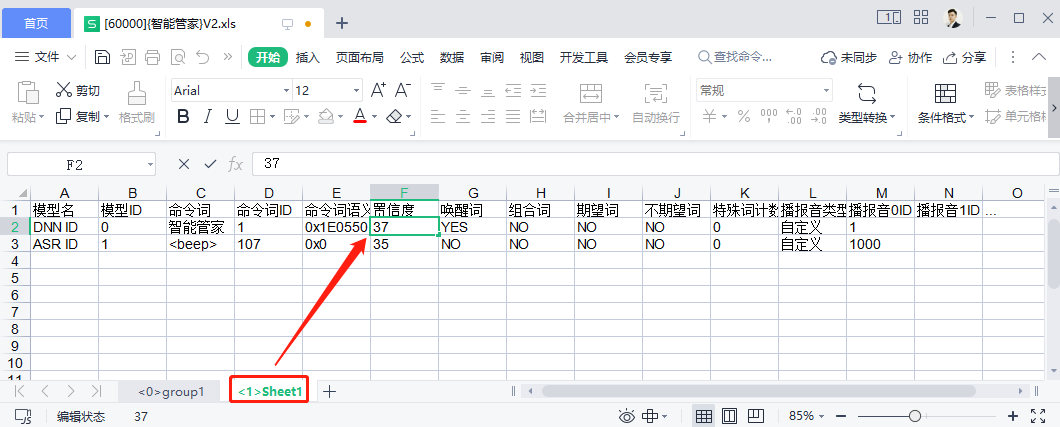 - Next, open the Excel file [60000]{......}.xls in the SDK project package at CI130X_SDK......\projects\offline_asr_pro_sample\firmware\user_file\cmd_info. Update the wake word confidence value in “<1>Sheet1” to match the value in the “confidence.txt” file (e.g., “37”);