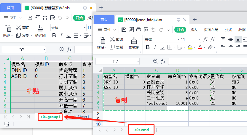 - Copy the content of the “<0>cmd” group from the “[60000]{cmd_info}.xlsx” spreadsheet and use it to replace the content of the corresponding group in the [60000]{......}.xls file located at CI130X_SDK......\projects\offline_asr_pro_sample\firmware\user_file\cmd_info;