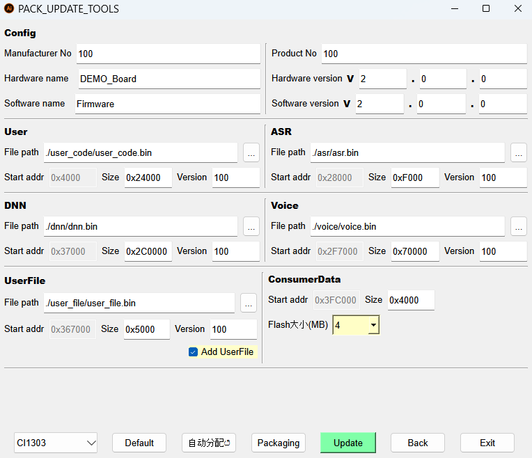 voice.binin the project directory (CI11XX_SDK\sample\internal\sample_xxx\firmware\voice). - Reserved Size: Increase or decrease in multiples of 0x1000, or keep the default.