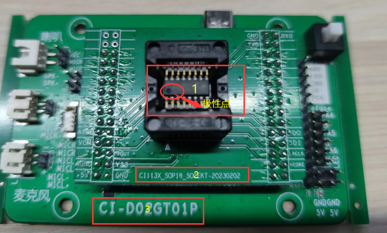 - Press down on the black frames on both sides of the socket as shown in the figure, and place the chip to be tested according to the diagram. Pay attention to the chip polarity mark and the silkscreen on the socket board. Note: The orientation of the adapter board, socket, and chip should match the direction shown in the image.