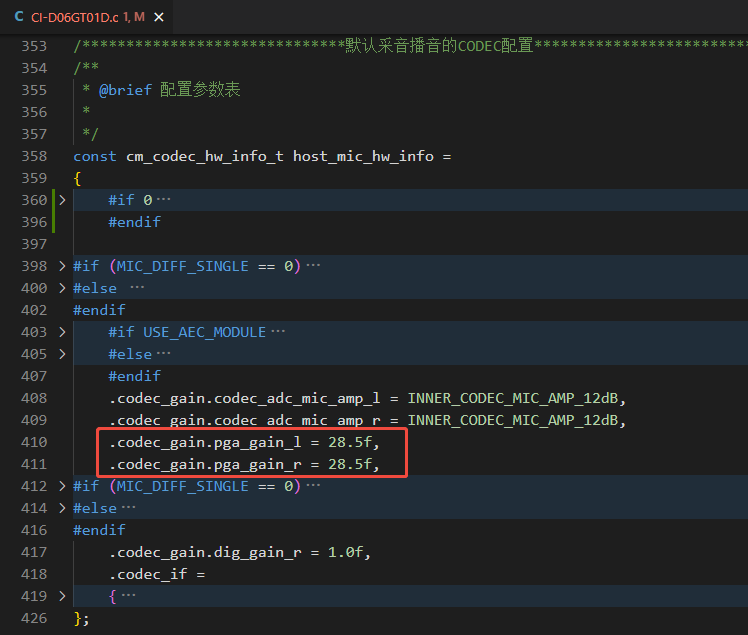 左右mic可以设置不同的PGA增益,例如修改板级配置文件CI-D06GT01D.c的参数,设置PGA增益的固定增益: