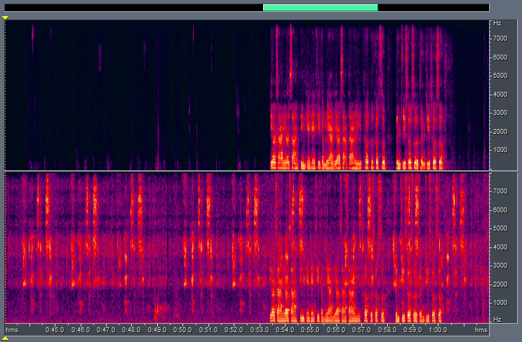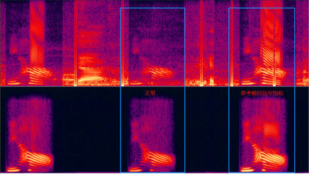 如图5-3所示的上、下通道信号分别为麦克风信号、参考信号,展示了参考信号正常、参考信号削顶的时域波形,图5-4是对应的参考信号语谱图,图中可以看到当有播放的时候参考信号有数据,无播放的时候,参考信号非常小接近为0。