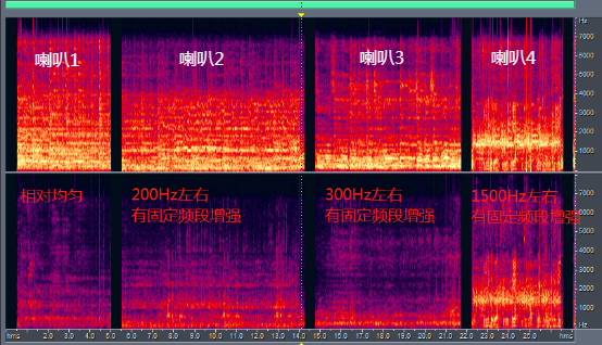 采用4个不同的喇叭播放相同的音频源,如图5-1的语谱图所示,喇叭2、3、4均存在固定频段能量增强的现象,即存在谐波失真,会严重影响AEC效果,尽量不用采用这种喇叭。