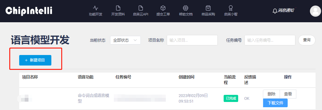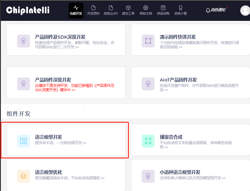 - 登录 ☞启英泰伦语音AI平台 , 如下图所示,点击(语言模型开发)图标进入语言模型界面: