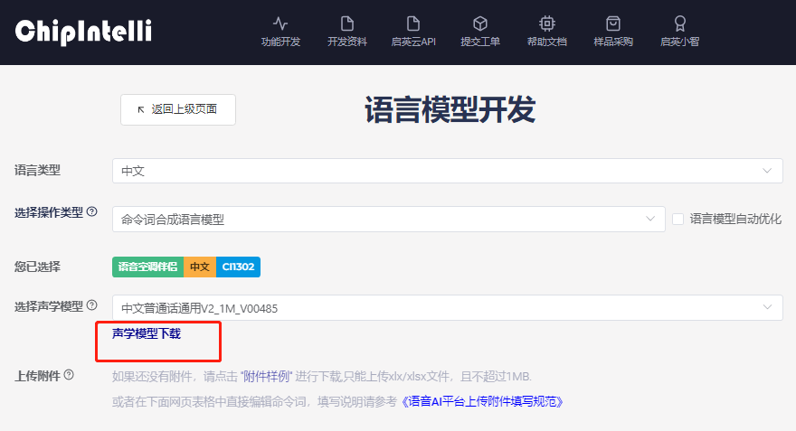 - 编辑命令词的界面,选择声学模型后,可下载声学模型