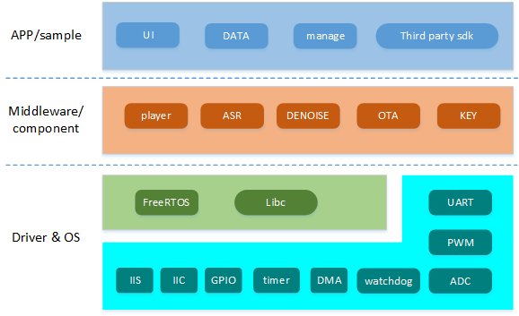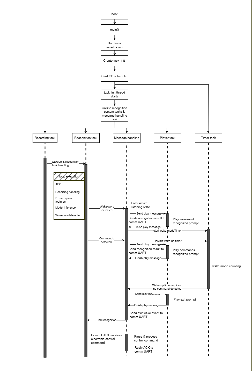 As shown in the figure above, after the system is powered on and started, enter the main function to initialize relevant hardware, and then create a vTaskCreate thread to start the FreeRTOS system. The vTaskCreate thread will create relevant threads for recognition and broadcast, and then the system will enter the sleep state and collect voice input.