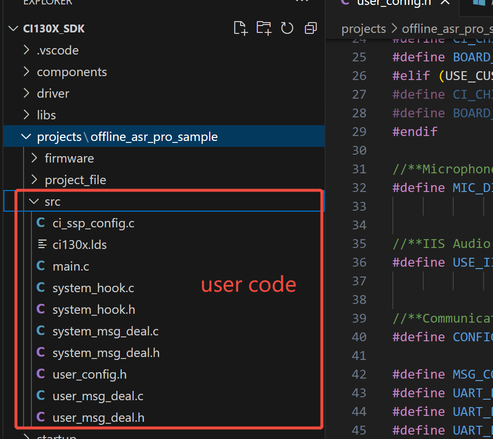 (3) Add processing code according to semantic ID, and find deal_asr_msg_by_semantic_Id function under CI130X_SDK\projects\offline_asr_sample\src\user_msg_deal.c.