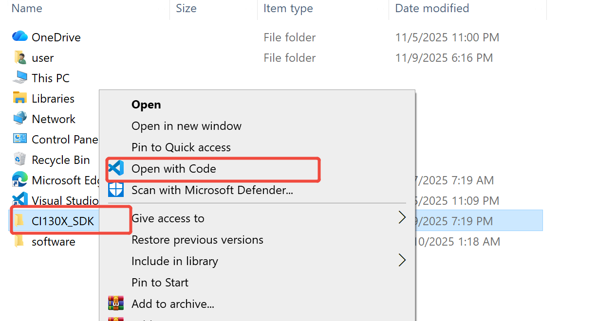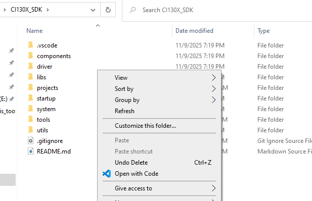 Method 2: Select the CI130X_SDK folder (parent directory of the .vscode folder), right-click and select Open with Code: