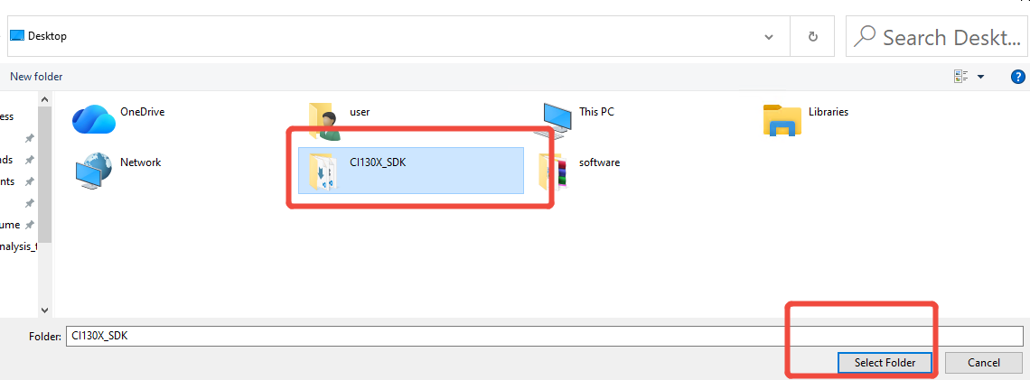 Method 3: First open the VSCode software, then go to Top Bar -> File -> Open Folder, and select the CI130X_SDK folder (parent directory of the .vscode folder) as shown in Figures 3-6 and 3-7: