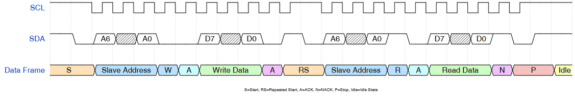- Stop condition: While SCL is high, SDA transitions from low to high to indicate the end of a transfer.