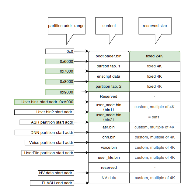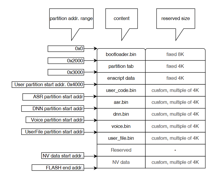 - Partition: A region in the firmware that contains one or more bin files. User‑configurable partitions include User, ASR, DNN, Voice, UserFile, and NV data; others are fixed.