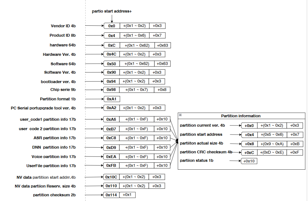 The partition table provides hardware/software names, the start address and actual size of each partition, version numbers, etc.