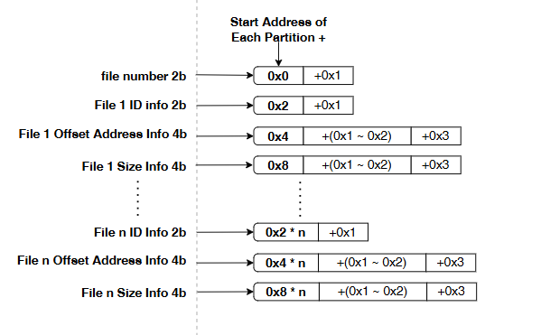 A partition may contain multiple files, distinguished by labels like “[ID]”. Use the partition table to get the base address, then parse the file header (file count, each file’s offset and size) to access contents.