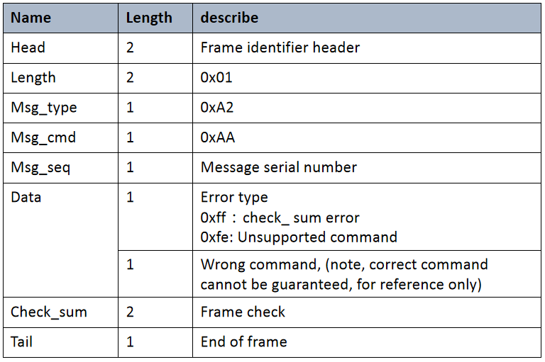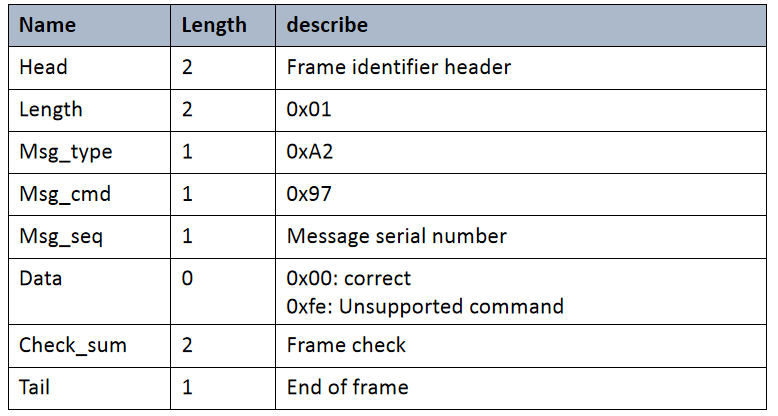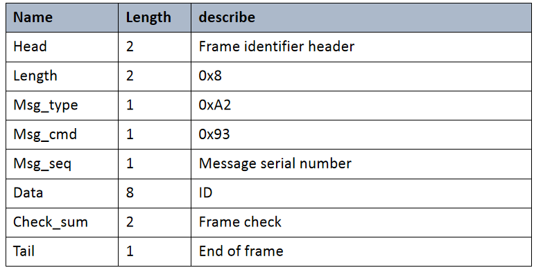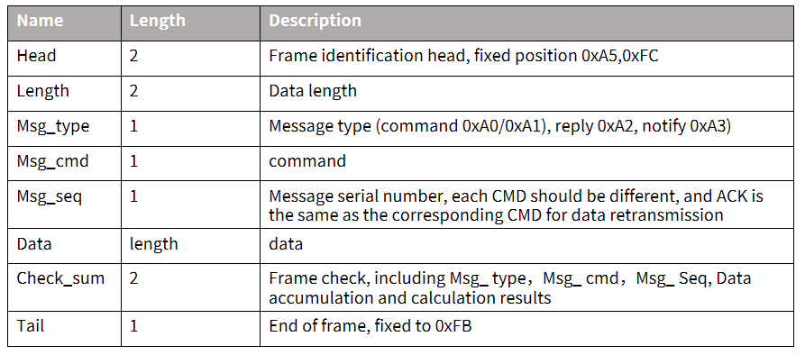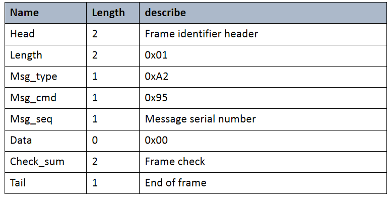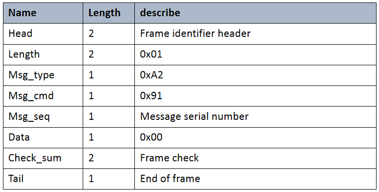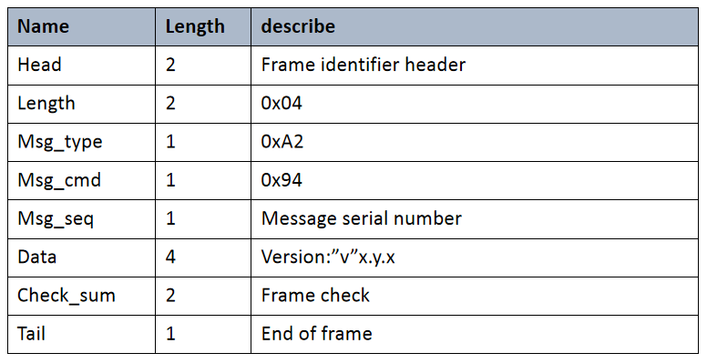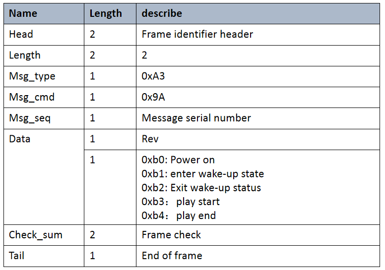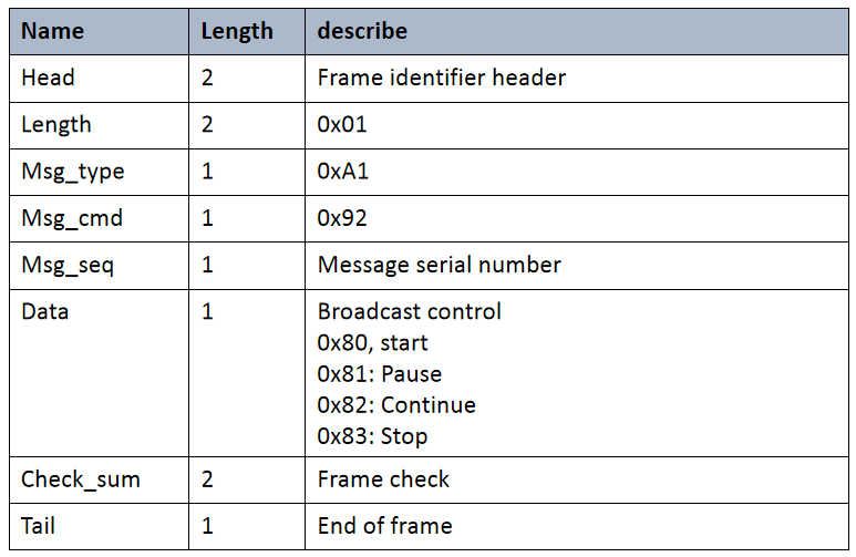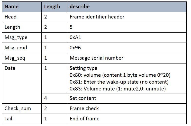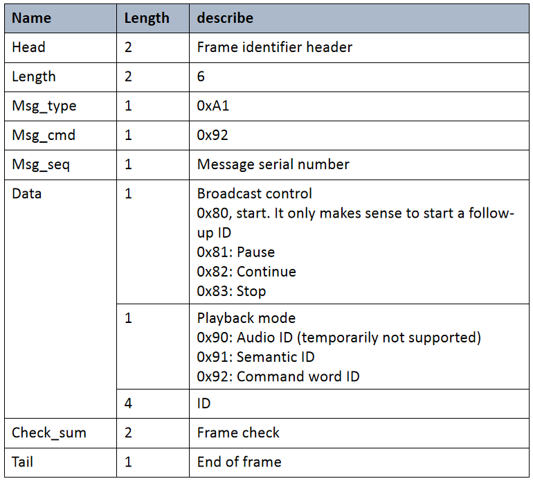 - Supported commands: query the protocol version number, query the system version number, set the volume (the volume rating is defined in user_config.h), play the local broadcast, reset commands, etc. The specific protocol format is shown in the following figure: