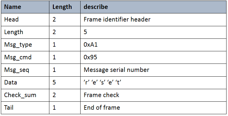 - Complete transmission package, including: head and tail, length, check, message type, and message serial number;