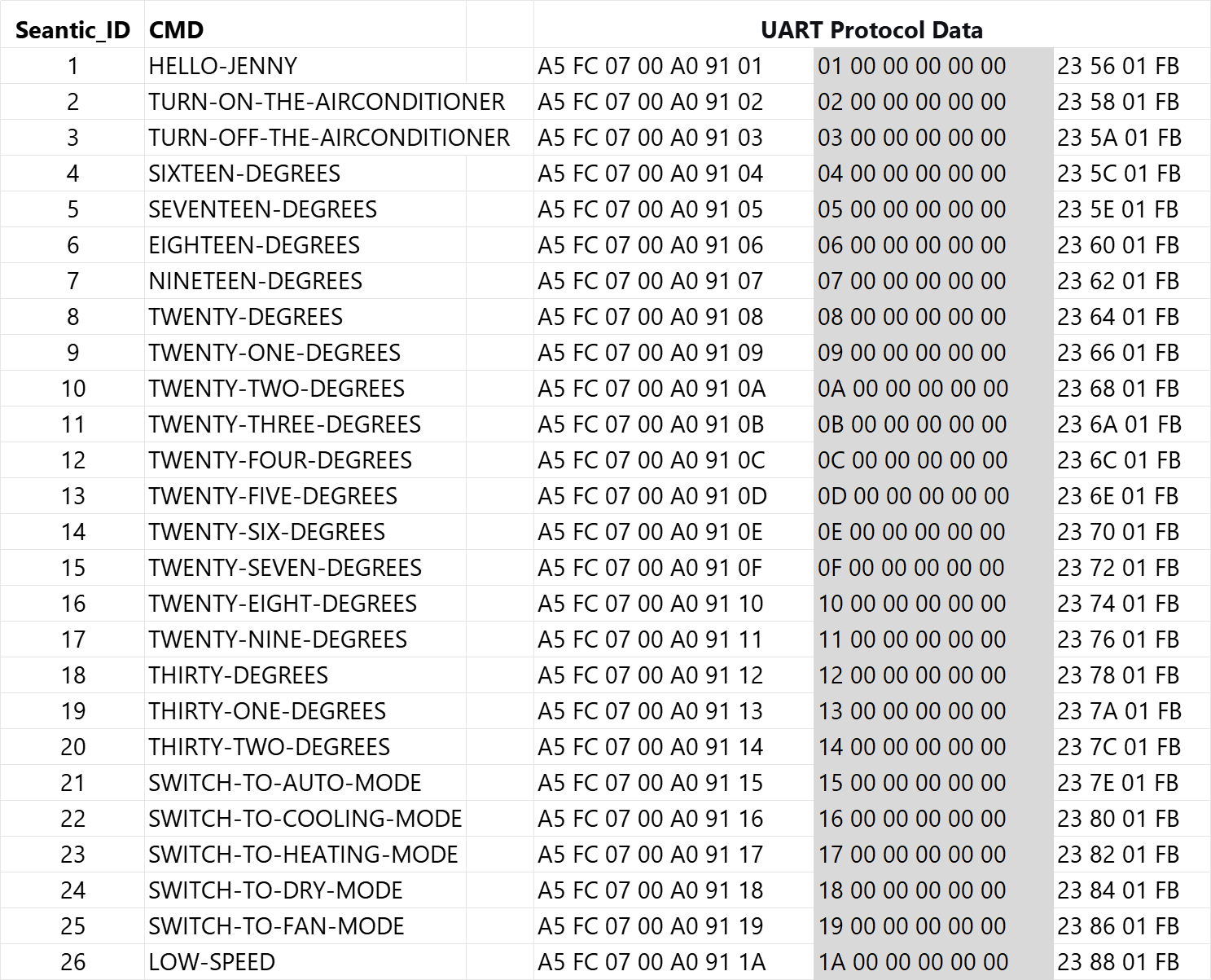 Taking the clothes pole as an example, when the user connects the UART of the mcu with the UART of the CI130X chip on the circuit, and the CI130X chip with UART protocol firmware is flashed to receive the corresponding voice command, the UART of the CI130X chip will send the protocol data as shown in the following figure. If the user sends out the command word of “打开吹风”, the CI130X chip performs voice recognition. After recognition, it will send out the UART protocol data as shown in the third line of the figure below. After receiving the data through the UART, MCU of the clothes dryer processes the recognition and finds that it is the protocol sent out by the command word of “打开吹风”, which can control the motor and other equipment to perform the action of opening blowing.