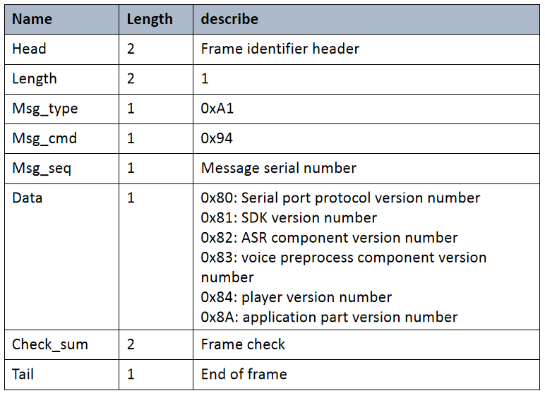 Note: Used to query the SDK version number used by the firmware in the voice module.