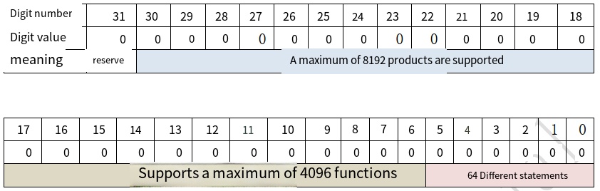 Bits 18 to 30: Product ID. Supports up to 8192 distinct products. For example, “turn on the AC” and “turn on the fan” can be distinguished by the AC (ID: 0xAF) and fan (ID: 0x9D) IDs, respectively. The specific definition of the Product ID in the