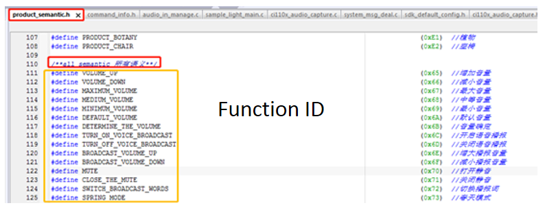For example, “loud voice” and “low voice” belong to different functions, and their function IDs are different. “Loud voice” and “Increase volume” belong to the same function, and their function IDs are the same, facilitating the processing of command words with the same function. The function ID is defined in the product_semantic.h file: