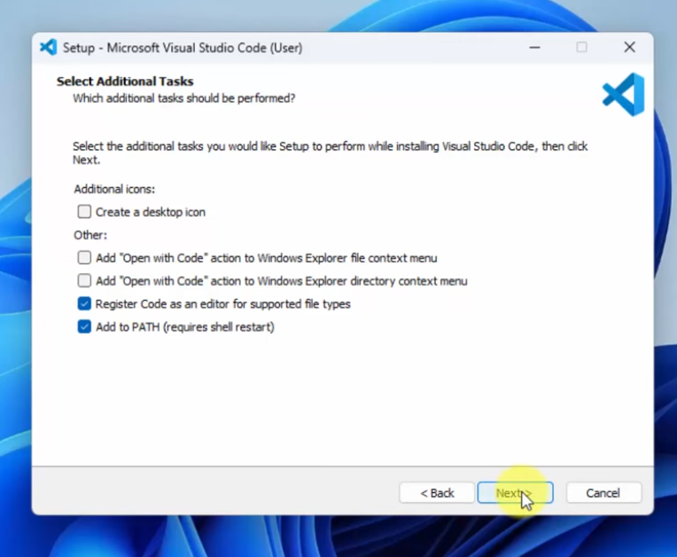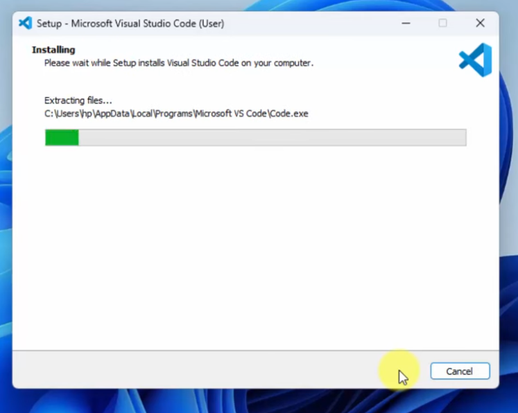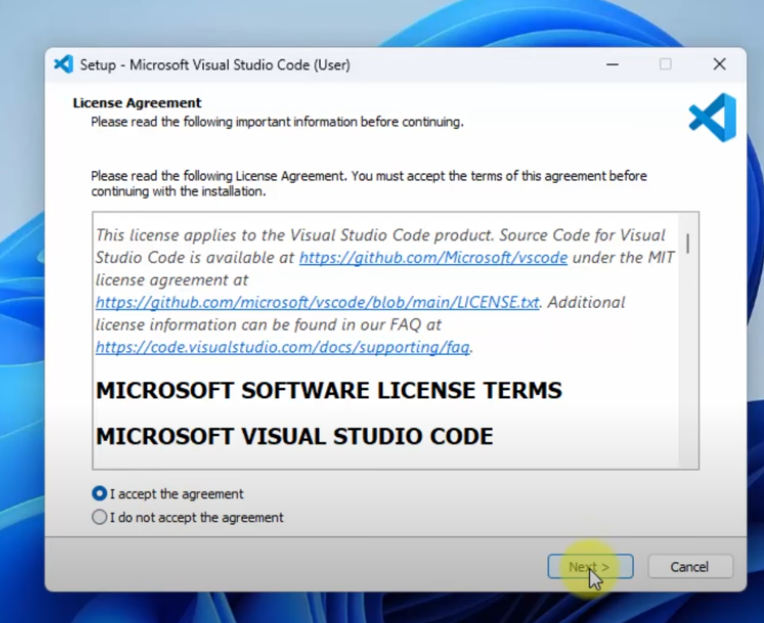 - Double-click to install VSCodeUserSetup-x64-1.60.0.exe, accept the license agreement, and proceed to the next step.