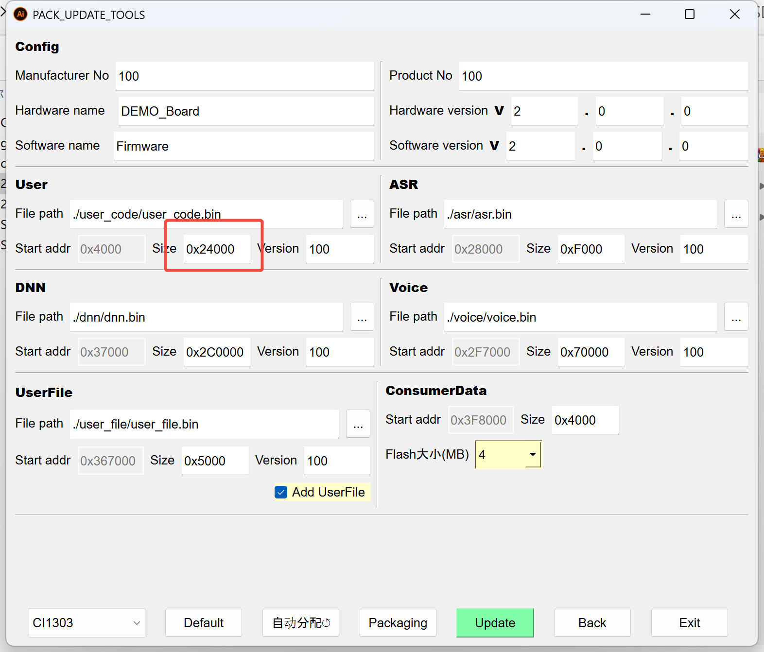 - Launch the pack and updatetool, navigate to the firmware packaging interface, and reserve an appropriate size for the user code partition as shown below: