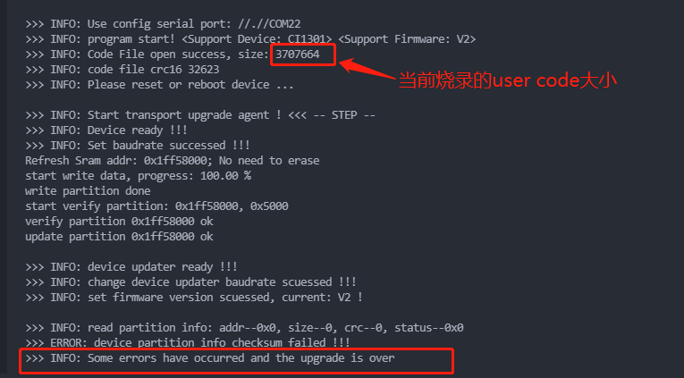 - Reason: The current size of use_code.bin exceeds the reserved size of the user partition in the firmware.- - - Solution: Use the firmware packaging tool to repackage the firmware and increase the user partition to a reasonable size. Refer to Section 6.1 for guidance.