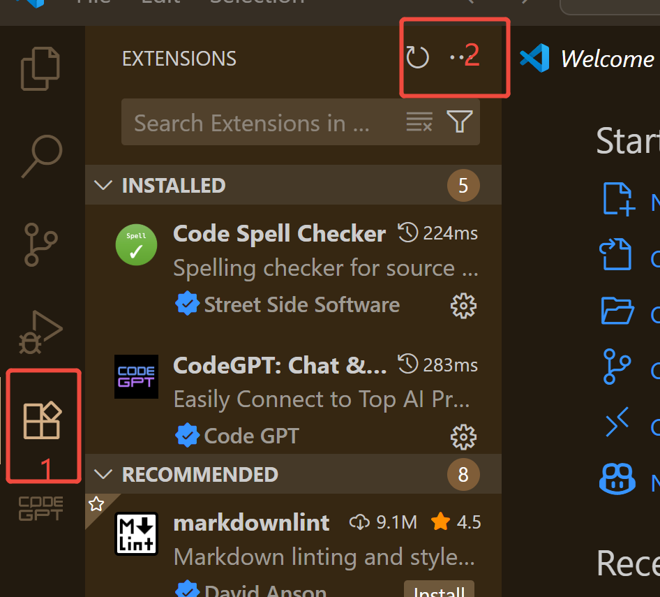 - First, install the extension. Click the software store icon on the left side as shown below, then click the three-dot menu icon in the top-right corner.