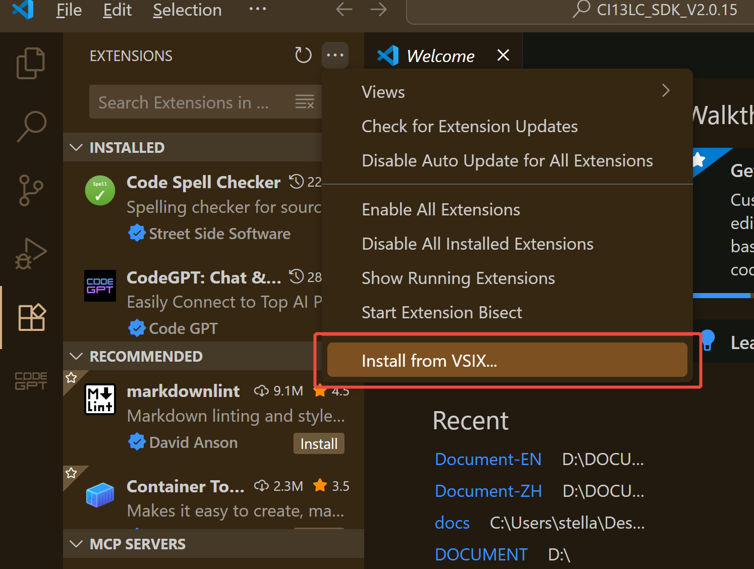 - In the options that appear after clicking the three dots, select “Install from VSIX” or “Installed from VSIX”.