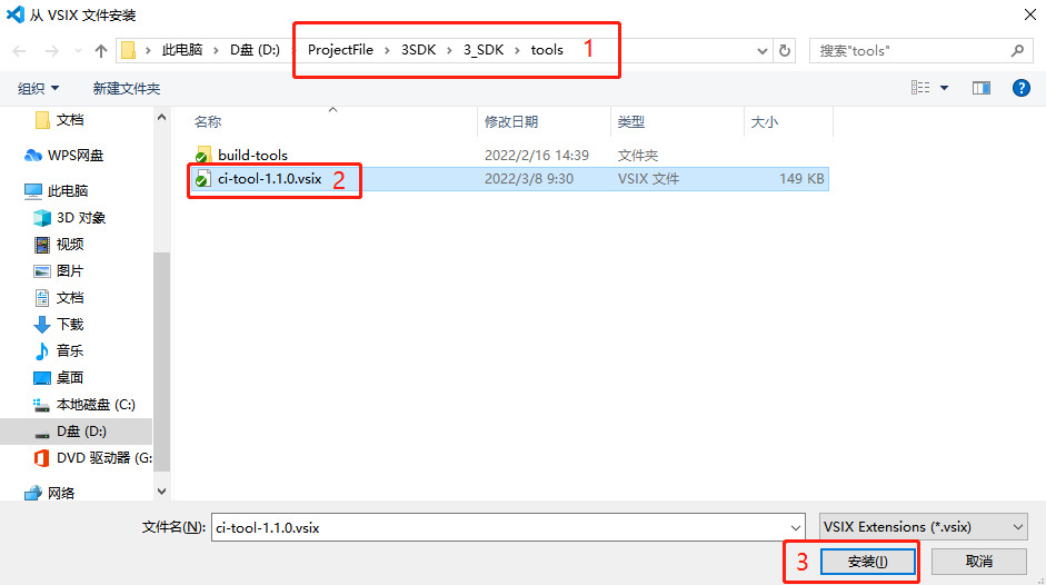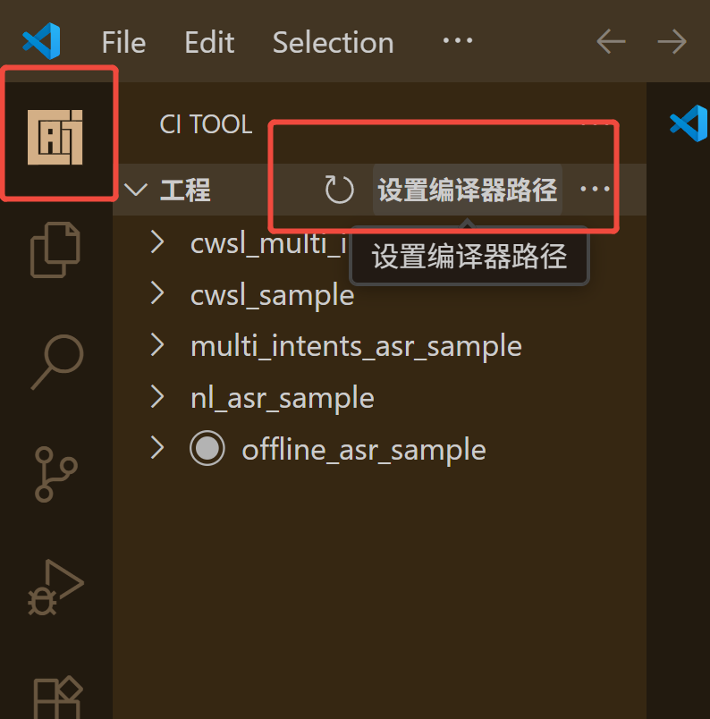 SDK/tools/ci-tool-1.1.0.vsix. Wait for the installation to complete, and the following compilation icons will appear in the top-left corner.
